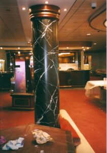 Quand j’arrive dans le local où je dois intervenir, j’ouvre mon coffre, je sors mes affaires et je m’installe dans mon boulot. Le registre de mes activités en peinture-déco sur les paquebots comprend tout ce qui est faux-bois, faux-marbre, dorure à la feuille, frises et peintures décoratives sur corniches, portes, cloisons et divers volumes. Dans un chantier naval, le recours aux illusions de matière a notamment pour intérêt de permettre des gains de poids. Comme sur les épontilles en métal ou sur les colonnes et les pilastres en staff où je vais réaliser, par exemple, du faux marbre en peinture. De même, pour des raisons de poids et de résistance au feu, le constructeur limite l’emploi du bois massif pour utiliser plutôt du contre-plaqué, des stratifiés avec parements en bois divers, ou… du décor peint. L’illusion de matière permet aussi de contourner des contraintes physiques. Lorsque les lignes de la coque, à l’arrière et à l’avant du bateau, imposent des courbures que les stratifiés ne supportent pas, les plaquistes réalisent des panneaux incurvés par bandes. Sur le Queen Mary II, il y avait, par exemple un salon-bar dont les baies vitrées donnaient sur la proue. Les cloisons dans lesquelles ces ouvertures étaient encastrées présentaient une double courbure, verticale et horizontale. Comme tout le reste du décor était en stratifié d’acajou, il a fallu que, par la peinture, je donne l’illusion que la partie courbe était, elle aussi, réalisée en acajou. Objectif atteint puisque les gens se sont demandés comment les menuisiers avaient réussi l’exploit de courber ces panneaux de bois dans les deux sens. Petite satisfaction personnelle…