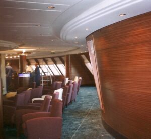 Le Queen Mary II ne voulait pas du tout être le plus gros paquebot du monde. Il n’y avait aucune surenchère de cette sorte. C’était un grand bateau, un monument. Cependant, la taille n’était pas son argument. Il avait une forme de vrai bateau, avec une proue et une poupe. Du coup, je me suis baladée sur le Queen Mary II. Je n’ai pas résisté. Je suis allée voir. Il avait effectivement des volumes magnifiques, de beaux matériaux, des lignes très stylisées, très sobres, tout à fait dans l’esprit « Arts décos » des années 30. J’ai voulu voir parce que j’avais conscience du caractère remarquable et esthétique de ce bateau-là. Ce n’était pas un immeuble flottant comme ces paquebots que l’on construits actuellement, qui consistent en des empilements de cabines, des façades de balcons et de baies vitrés posés les uns à côté des autres au-dessus de l’eau, et qui sont reproduits à l’identique avant d’être livrés sans grande cérémonie à leurs armateurs pressés de les rentabiliser.